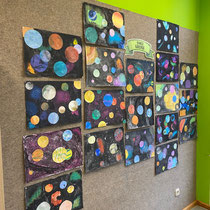 Die 5. Klasse ist in dieser Woche in Galaxien vorgedrungen, die nie ein Mensch zuvor gesehen hat. Passend zum aktuellen Thema "Unser Sonnensystem" in GPG wurden die Schülerinnen und Schüler kreativ und gestalteten eigene Galaxien. Dabei entstanden einzigartige und fantasievolle Ausblicke in den Weltraum.